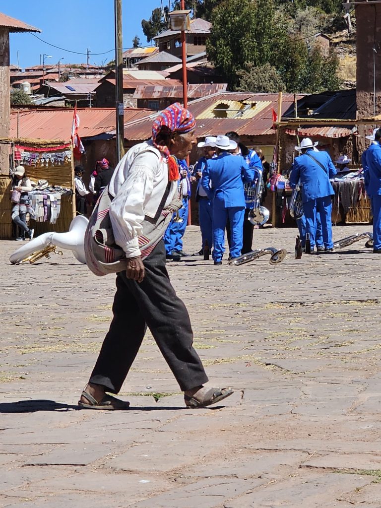 Na een warm afscheid (we hebben de kleding toch maar achtergelaten) varen we in een ruim uur naar Taquile waar onze gids ons het eiland laat zien. Een fijne wandeling, en op t dorpsplein is een feest gaande ter ere van de onafhankelijkheid. Iedereen loopt in traditionele kleding, de muziek speelt en het is feest. Leuk om dat mee te maken.