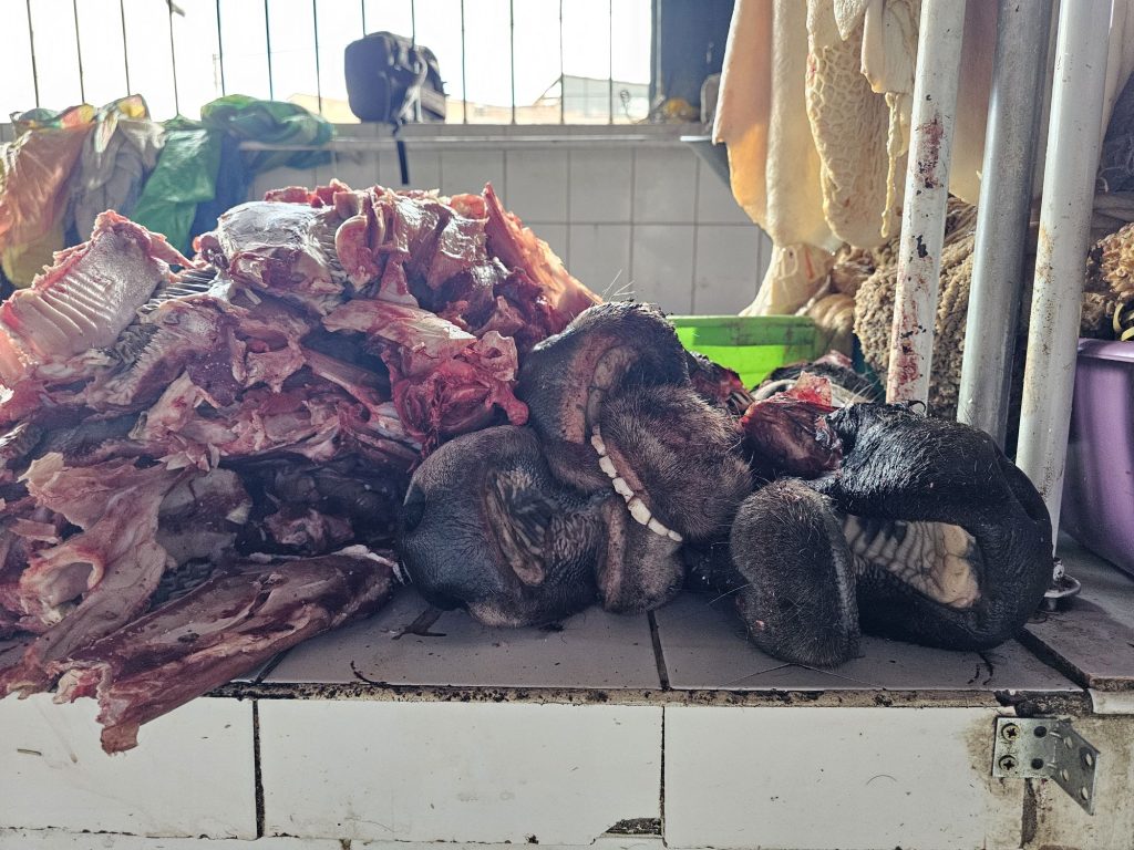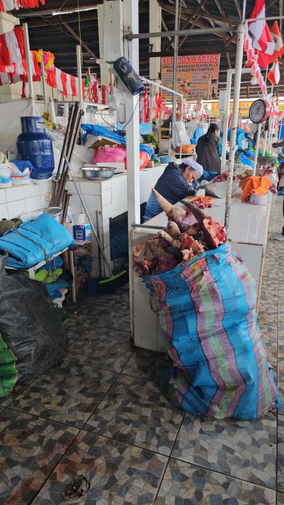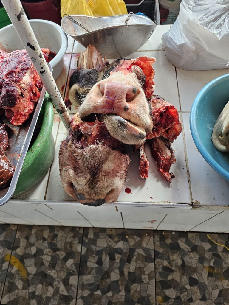 Ook waren er veel sapkraampjes waar men het verse fruit verwerkt en je deze verse juice aan een klein tafeltje kunt opdrinken. Dieper de markt inlopend kwam ik steeds meer kruiden en specerijen tegen. Verse koffiebonen en gemalen kruiden, vanalles. En ineens stond ik bij een trapje dat naar een lager gelegen gebied leidde. De vleesafdeling. Runderen en varkens waren er die dag en geloof me: er wordt níets van deze dieren níet gebruikt. Ik moest soms zelfs even goed kijken waar ik naar stond te kijken: koeienkaak, -snuit of de hele ontvelde kop met ogen er nog in, of..? En dat alles natuurlijk zonder ijs of koeling. Van de ongeboren kalfjes die tijdens het slachten tevoorschijn kwamen heb ik geen foto gemaakt. Dat ging zelfs mij te ver…