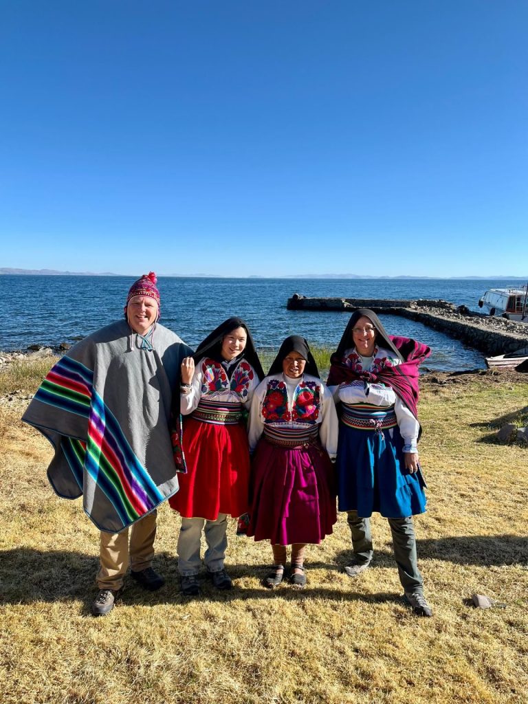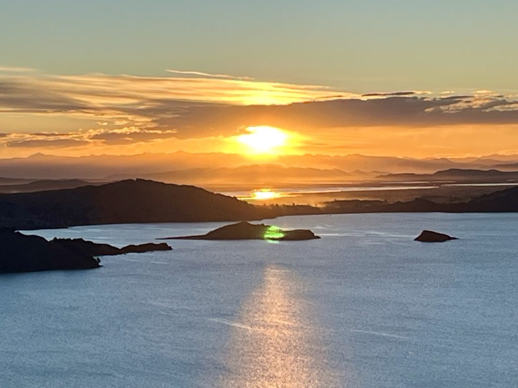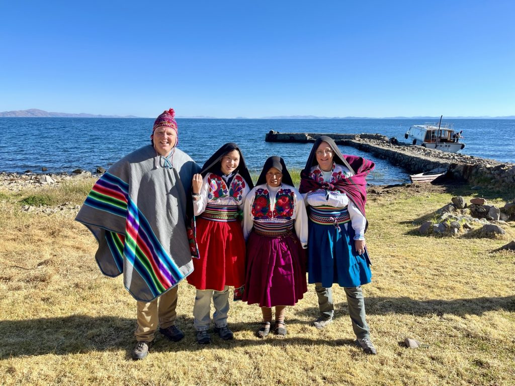 Na dit indrukwekkend bezoek varen we door naar het eiland Amantaní, zo’n 2 uur varen van de  Uros- eilanden. We slapen bij gezinnen thuis: een homestay. Op dit eiland zijn de mensen volledig zelfvoorzienend. Ze hebben hout, klei en stenen om te bouwen, akkers om te bewerken en met de oogst en het borduurwerk dat ze maken, gaan ze in Puno ruilen voor wat ze aanvullend nodig hebben. Tijd speelt geen rol, de dag wikkelt zich af zoals hij komt.