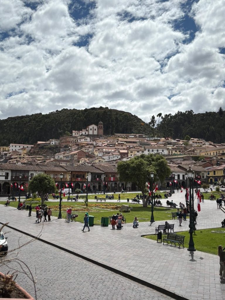 Uiteindelijk arriveren we op tijd in Cusco.  Cusco is een levendige gezellige stad met veel Spaanse invloeden. Ons hotel zit aan een prachtig pleintje met veel bomen en groen en overal zijn kleine balkonnetjes waar restaurantjes zitten. En het barst hier van de winkeltjes en straatverkopers. Tja, logisch dat men in deze drukke stad probeert wat te verdienen.