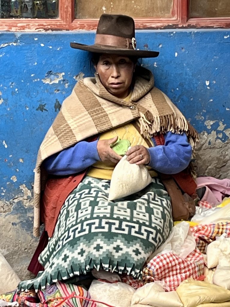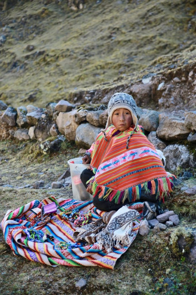 De weg naar beneden voerde langs beken, rotsige heuvels en alpenweiden. In Cancha Cancha, een geïsoleerde gemeenschap zonder elektriciteit, werden we hartelijk begroet door een groep vrouwen die hun zelf gemaakte waren aanboden.