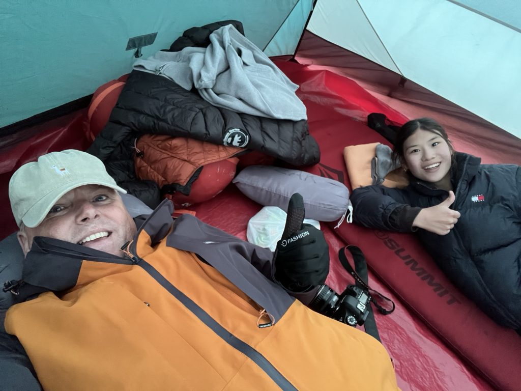 Toen we uiteindelijk de campsite bereikten, stond niet alleen mijn tent er al, maar ook de geur van iets heerlijks in de lucht. Onze kok wist op een klein gasbrandertje op 3.800m hoog een complete warme maaltijd te bereiden soep, rijst, verse groente, zelfs warme chocolademelk. Hoe hij dat voor elkaar kreeg? Geen idee. Maar het smaakte als sterrenrestaurantniveau, daar in de kou.